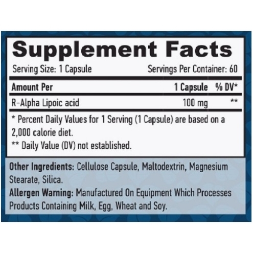 Состав: R-альфа липоевая кислота, мальтодекстрин, стеарат магния, диоксид