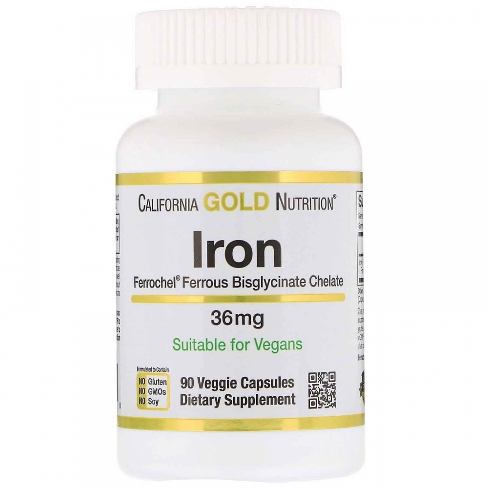 Производимое California Gold Nutrition железо содержит хелатный бисглицинат железа Ferrochel®. Подходит для веганов и вегетарианцев.