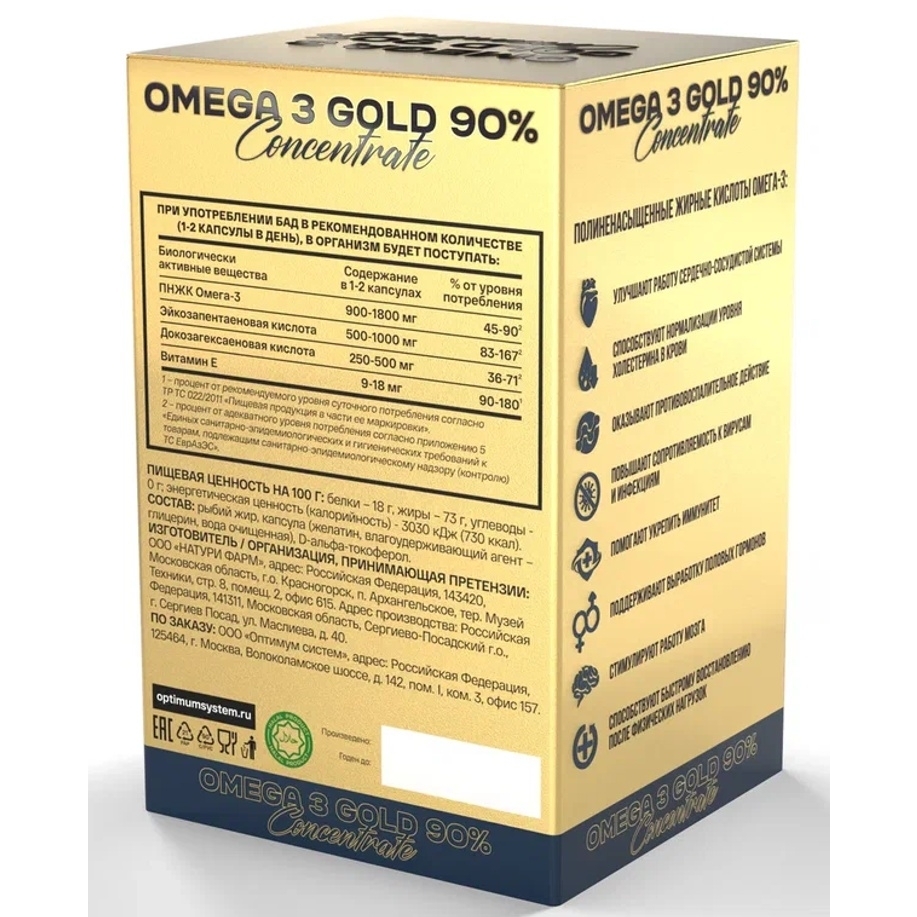 OMEGA 3 GOLD 90% — ультраконцентрированный источник омега-3 полиненасыщенных жирных кислот (ПНЖК), помогающий восполнить дефицит в рационе. Высокое содержание ЭПК (эйкозапентаеновой кислоты) и ДГК (докозагексаеновой кислоты) обеспечивает максимальную биодоступность и выраженный эффект для здоровья сердца, мозга и сосудов.