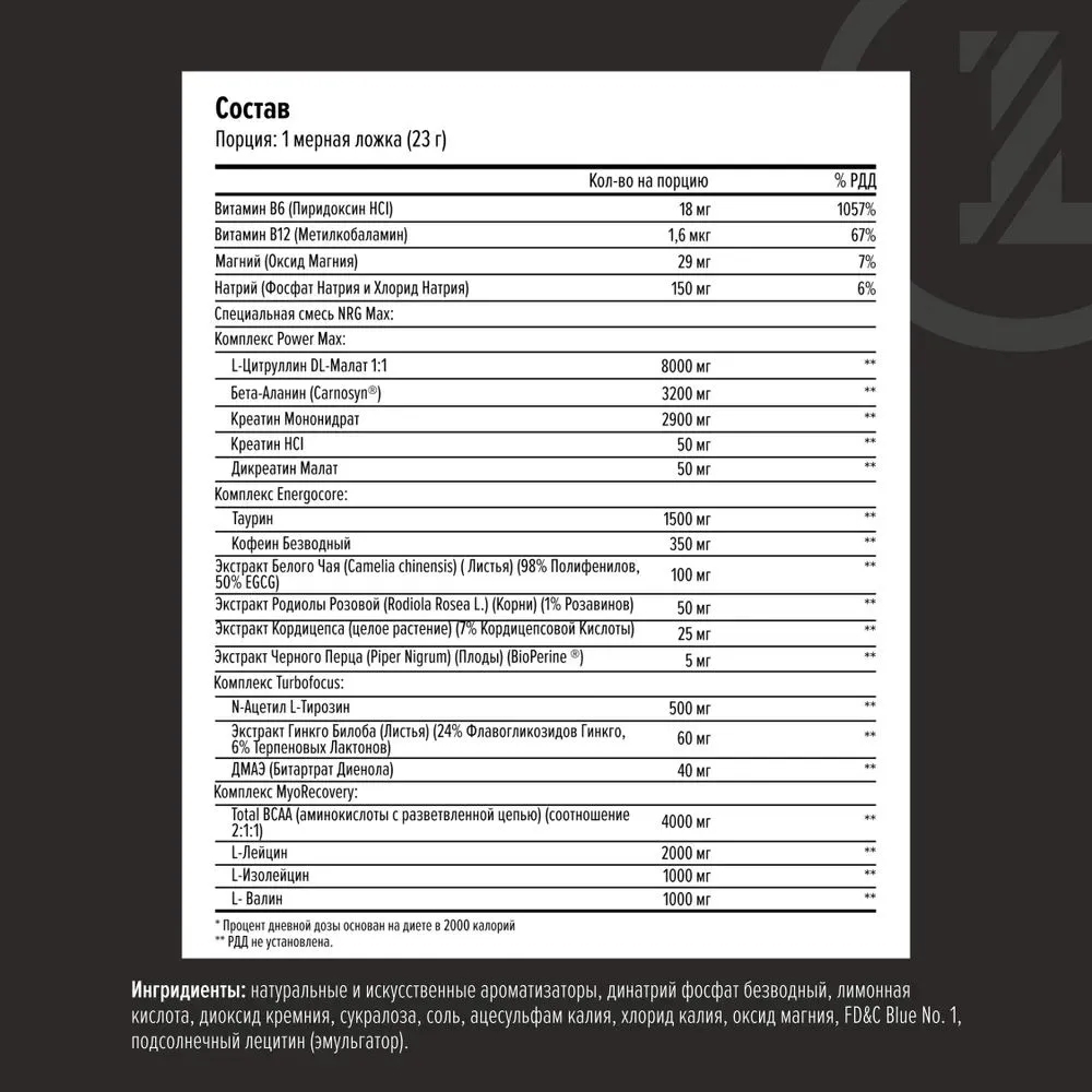 ENERGOCORE комплекс – это новый хардкорный энергетический комплекс в который входит: цитруллин малат, бета-аланин и кофеин. Эти ингредиенты работают вместе, чтобы повысить вашу выносливость и дать вам мощный прилив энергии, что позволит сделать ваши тренировки по-настоящему эффективными.